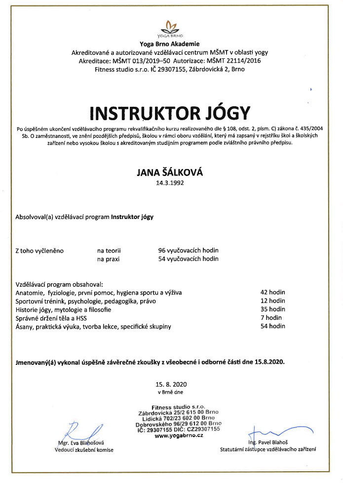 | 8/2020 | Kurz instruktor jógy (150 hodin), Brno |
